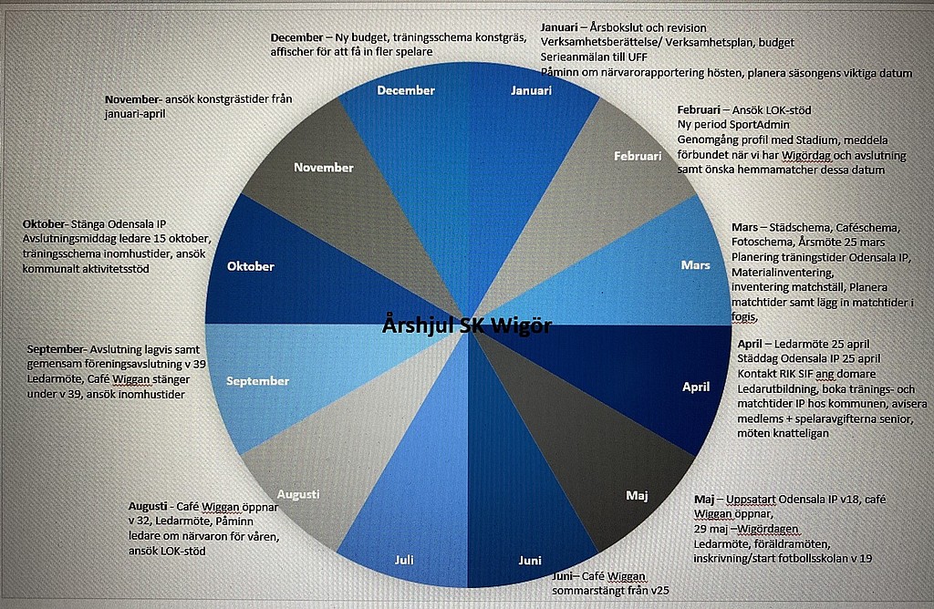 Under fliken "Dokument" och sedan "Ledare och tränare" finns ett Årshjul som vi tagit fram som stöd för alla inom föreningen. Där återfinns viktiga datum och ungefär vad som sker inom föreningen varje månad. Tanken är att alla ska känna sig mer delaktiga och få inblick i verksamheten.